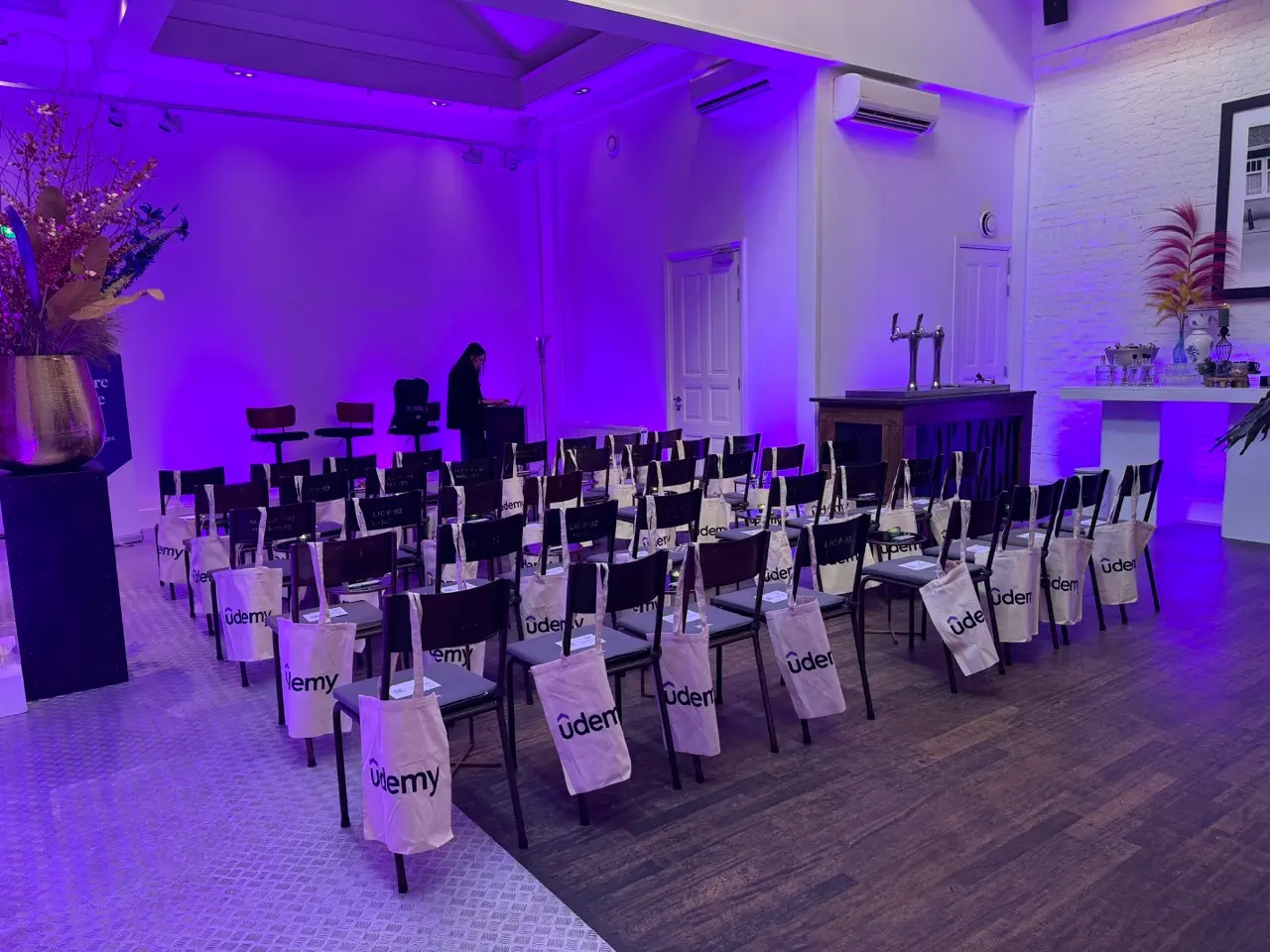 Udemy asked Curly to provide costs for a ‘full’ roadshow, utilising a stage set and crew travelling to multiple European capitals. We provided a budget and overview of logistics, and discussed with Udemy the pros and cons of running a full-scale roadshow at this stage in the company’s development. This honest collaboration helped Udemy identify that, for 2024, a scaled down solution was more appropriate for their needs and budget. Curly then advised on event formats, sourced venues to welcome 50 clients and prospects, created event branding and provided on-site presence to support the team.
